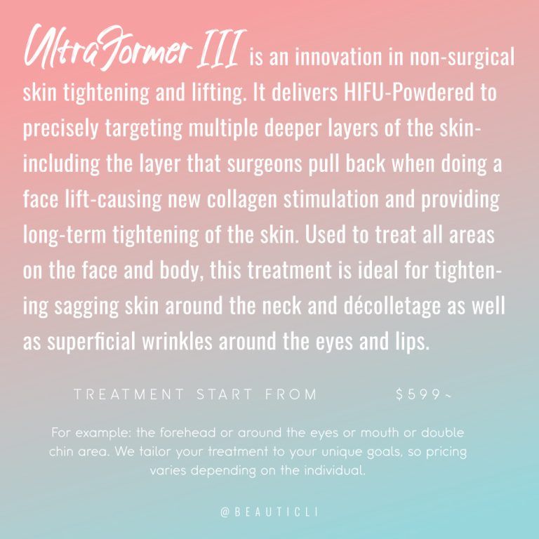 Ultraformer III is an innovation in non-surgical skin tightening and lifting. It delivers HIFU-Powdered to precisely targeting multiple deeper layers of the skin – including the layer that surgeons pull back when doing a face lift – causing new collagen stimulation and providing long-term tightening of the skin. Used to treat all areas on the face and body, this treatment is ideal for tightening sagging skin around the neck and décolletage as well as superficial wrinkles around the eyes and lips.
